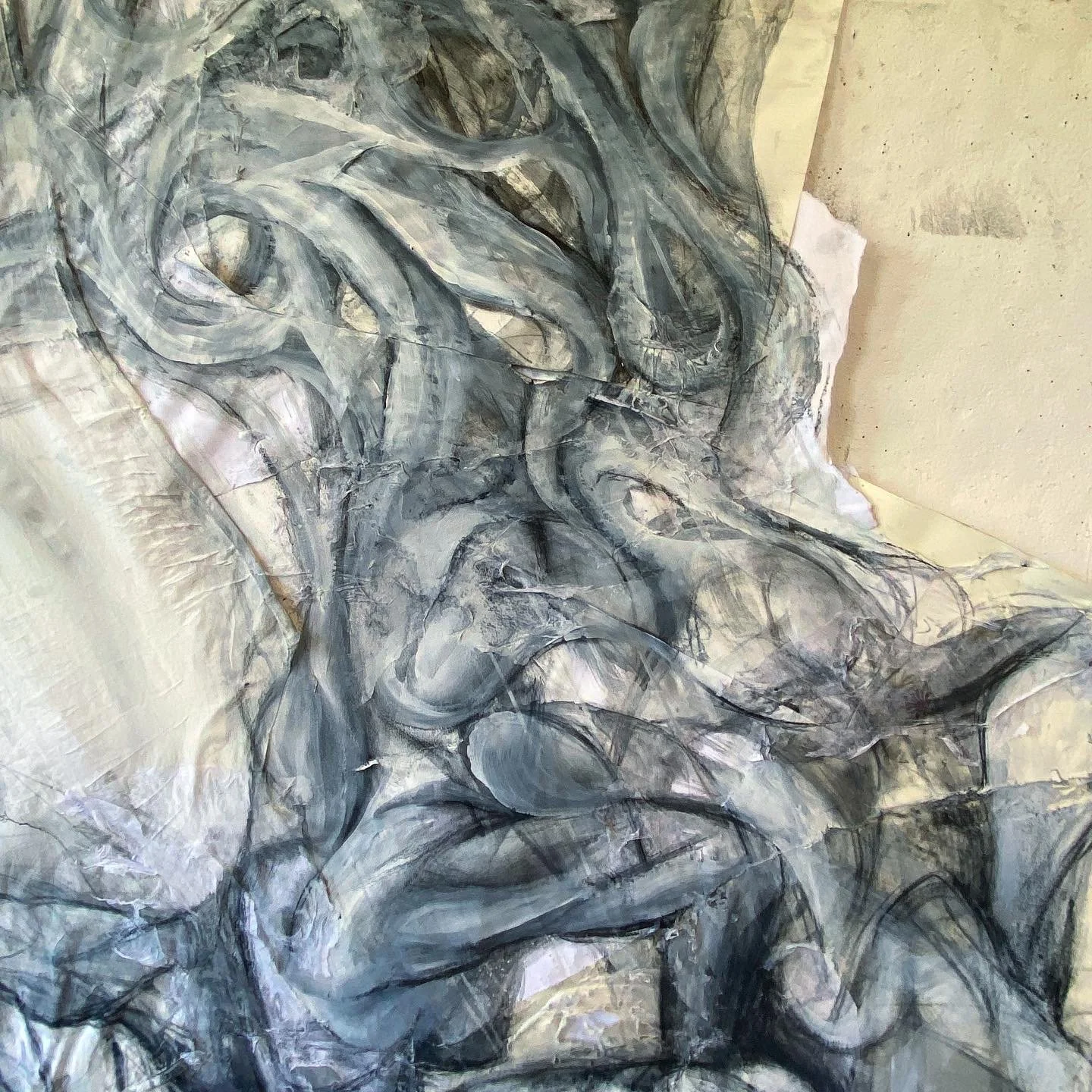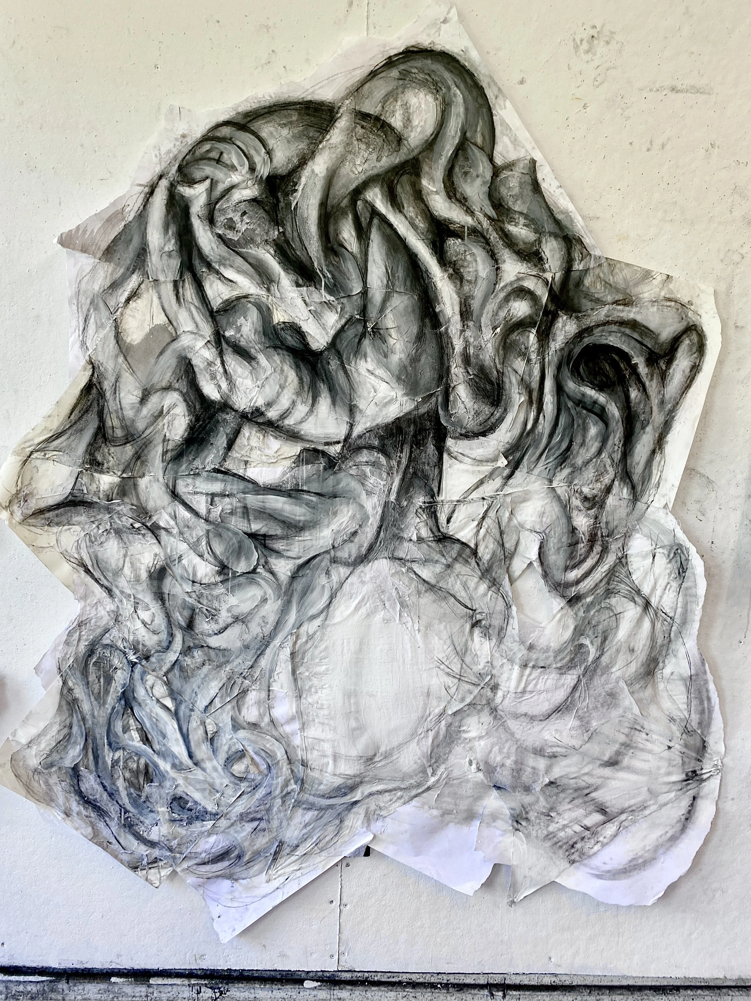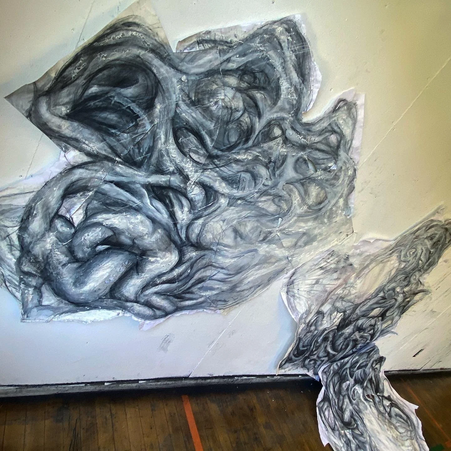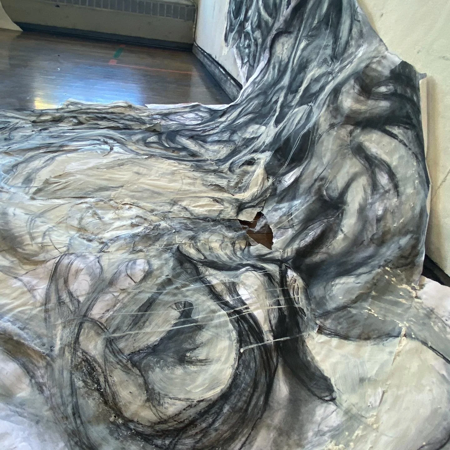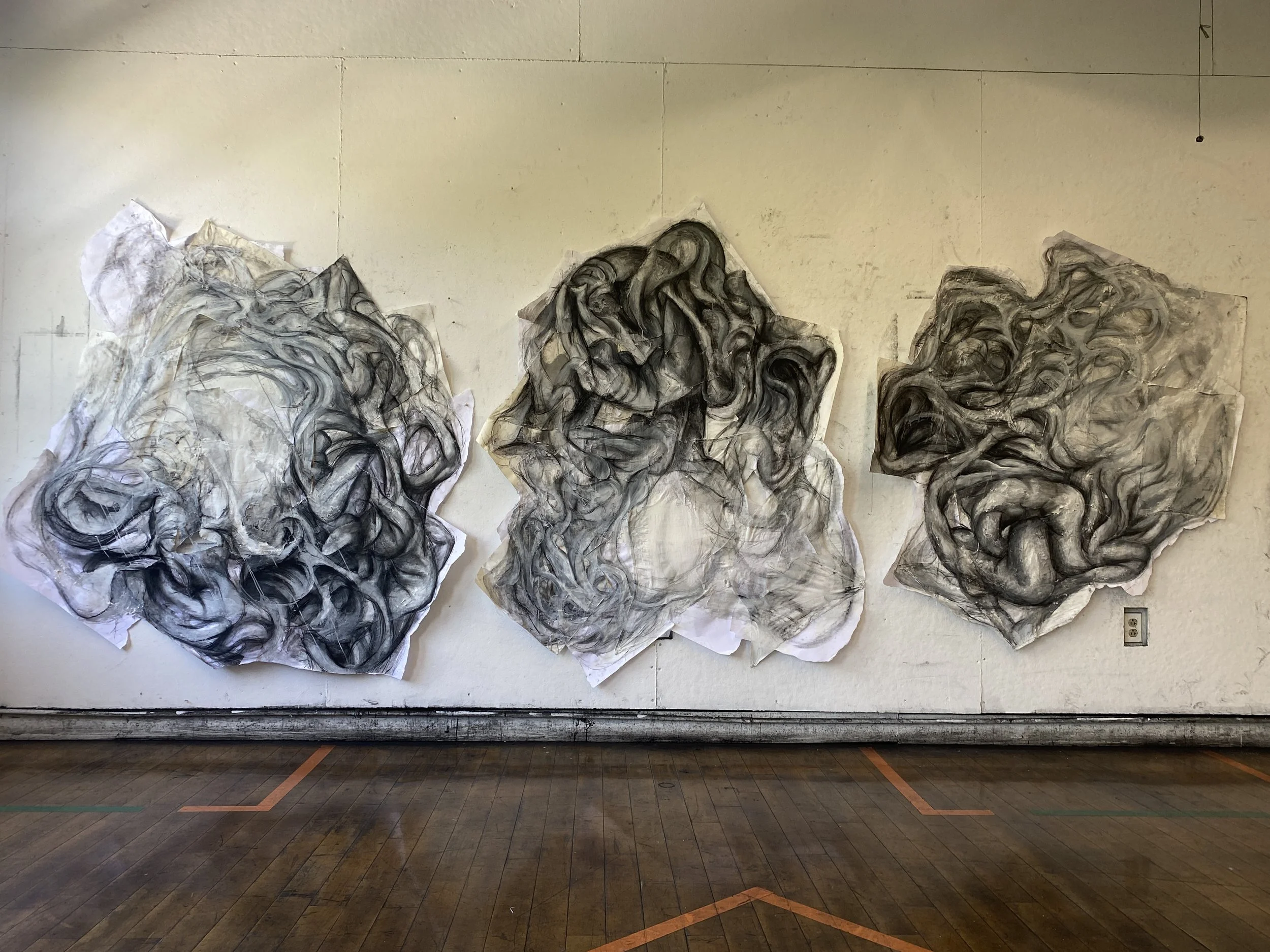 “A dispute of matter” Charcoal, ink, pastel, and gesso on paper and fabric collage. Each round ~5 x 5’