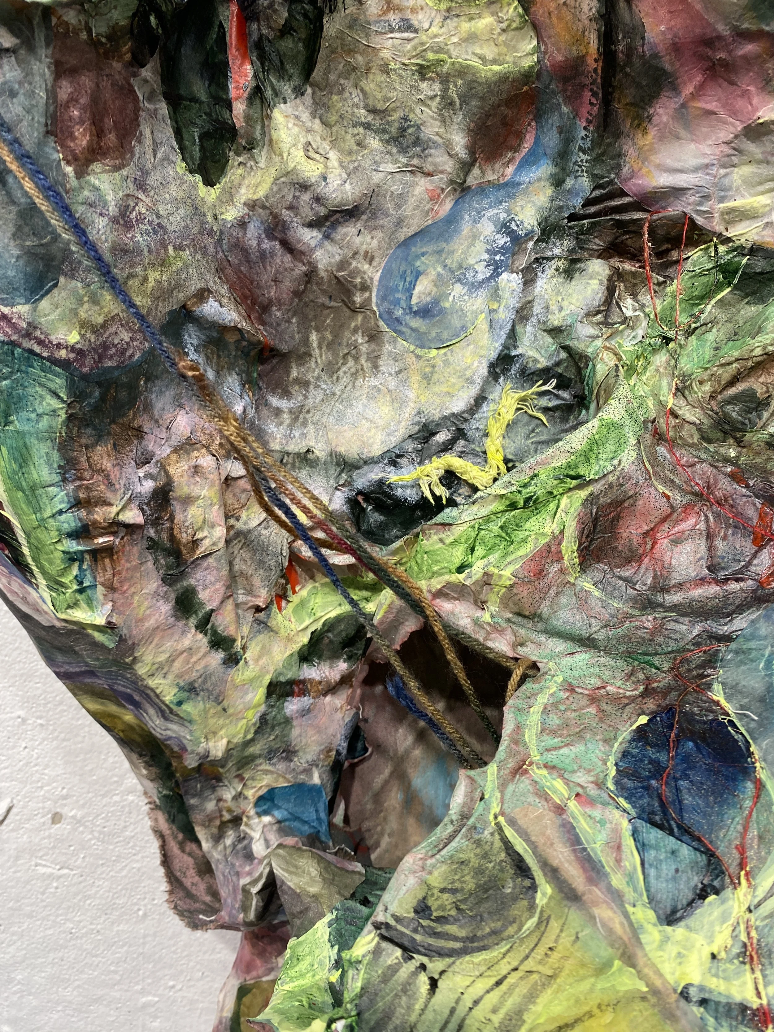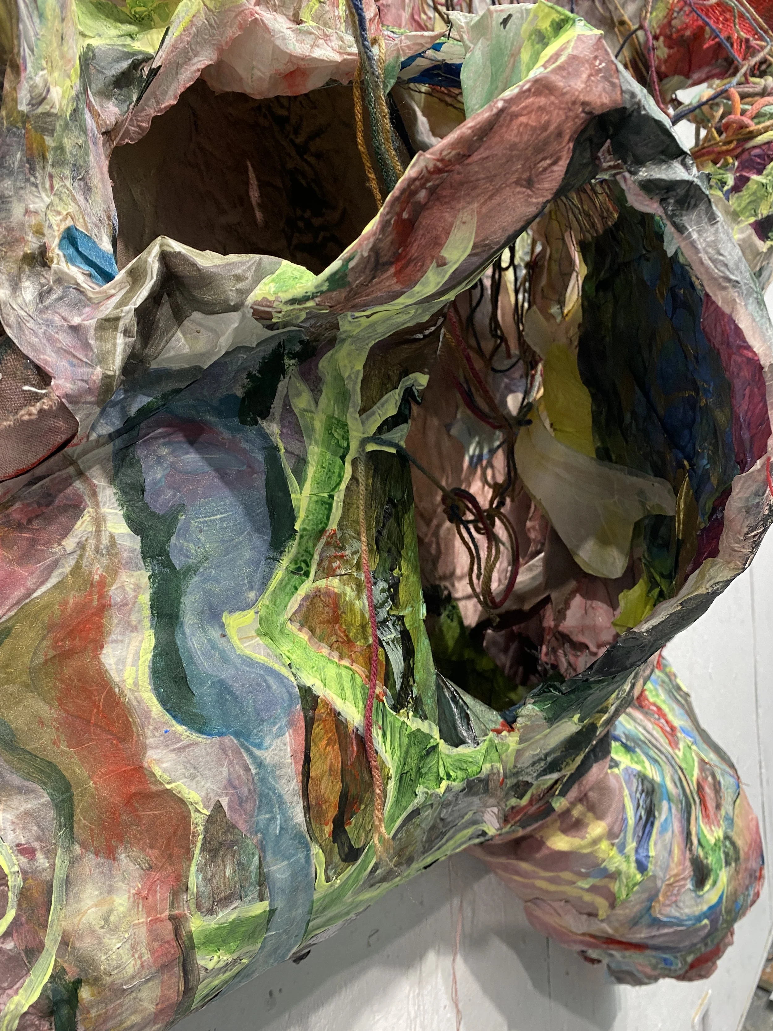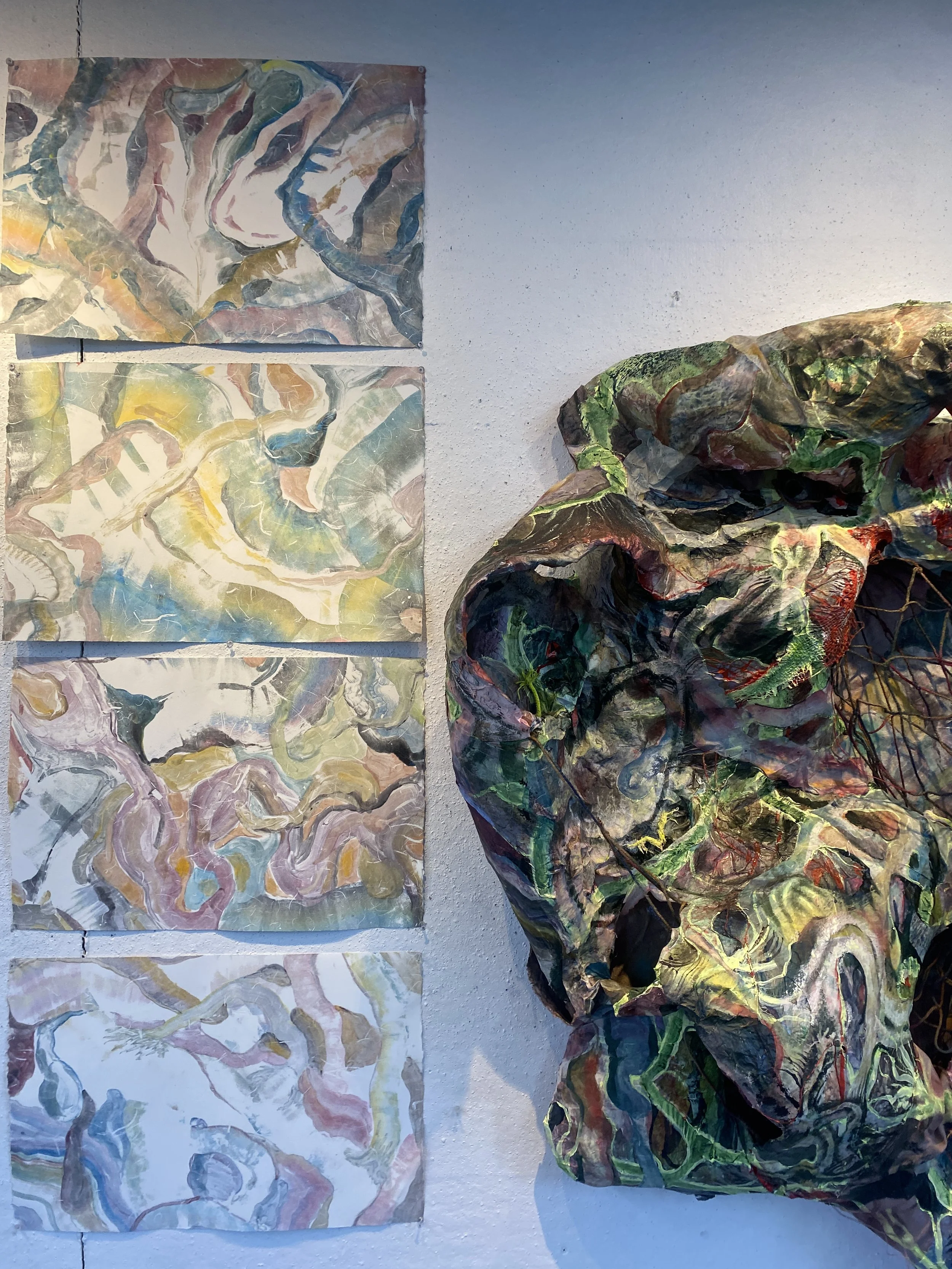 This cavernous sculpture is a highly layered and richly textured landscape, also behaving as a bodily figure with the sloping form and extended ‘limbs’. In this way, the cavern is living and mid-transformation, a cocoon of morphing matter. Utilizing the press for this process, as dozens of monotypes are embedded into the sculptural form, exemplifies the immense pressure which accompanies cavernous formations as well as queer desiring for transformation and change. This piece engages the viewer in a way that mimics the type of curiosity and transformation that fuels my practice for myself: A making process that engages my whole body and considers permeability between interiority and exteriority, and vulnerability. The viewer gets to take part in this three dimensional painting, where caverns dip into openings and one must follow their curiosity deeper into the piece. The cave is a place for exploring yearning, curiosity, rest, and radical desires. The cave both retreats and beckons, playing with ideas of tension and slack, tangle and fray.