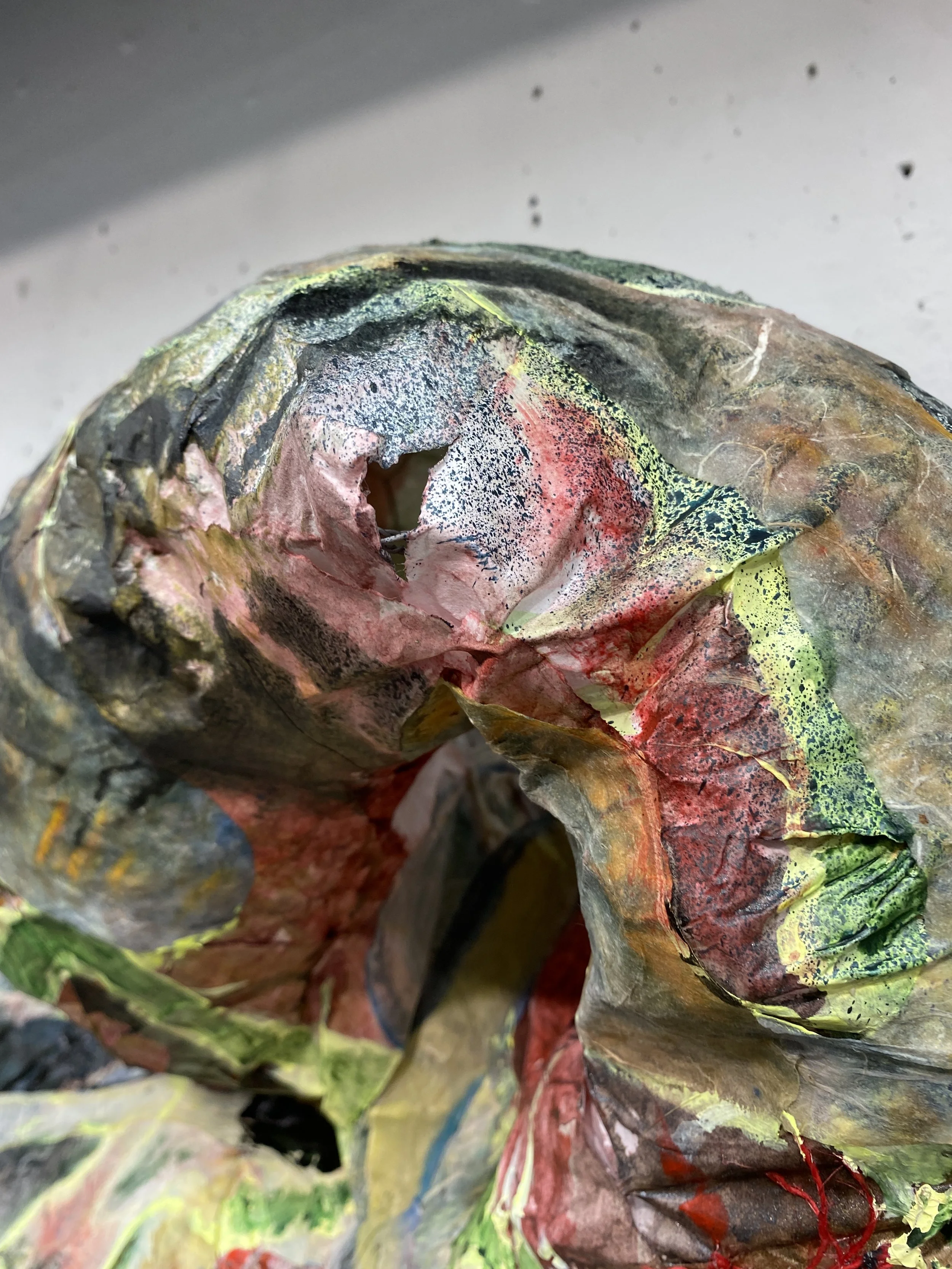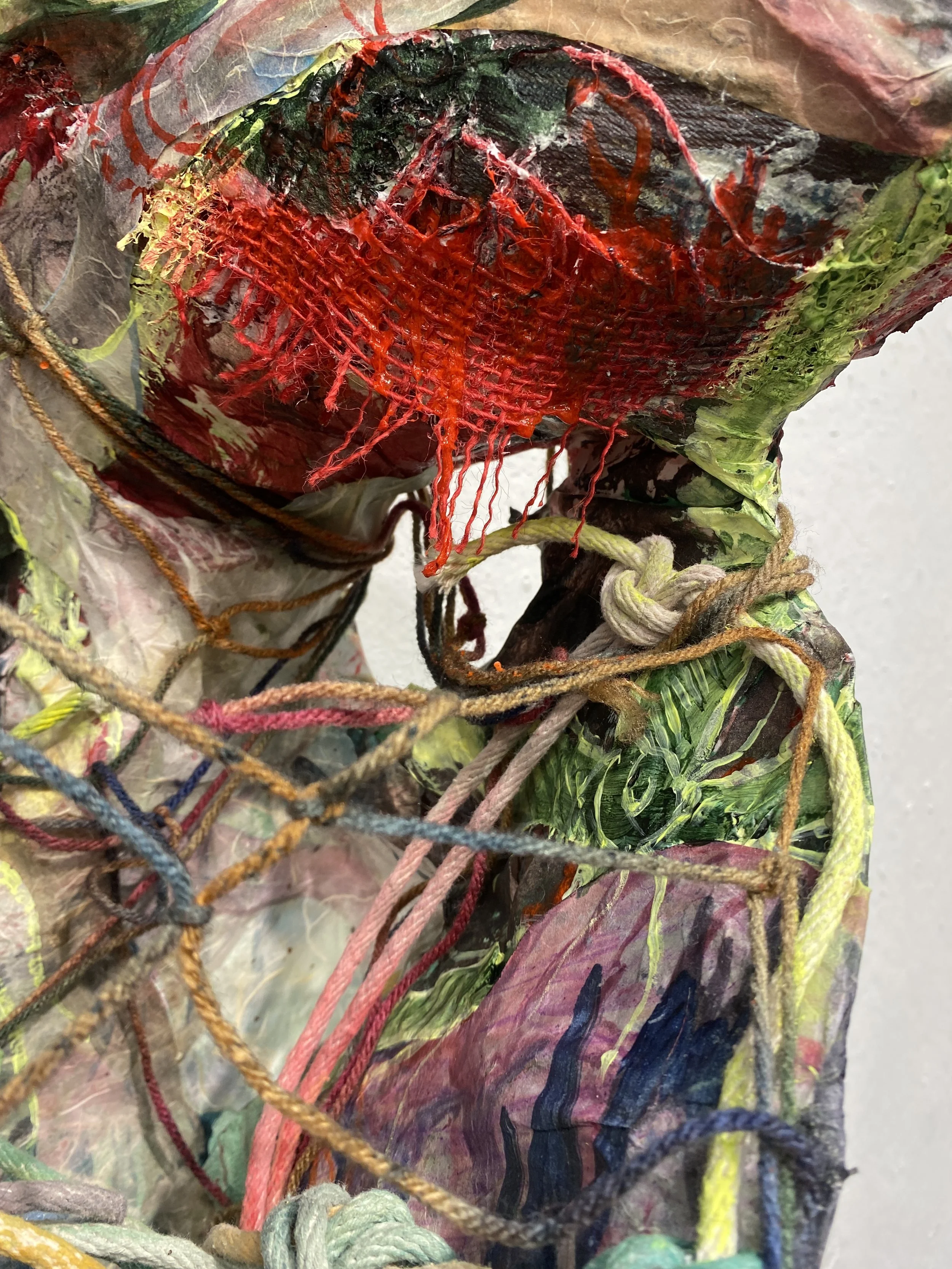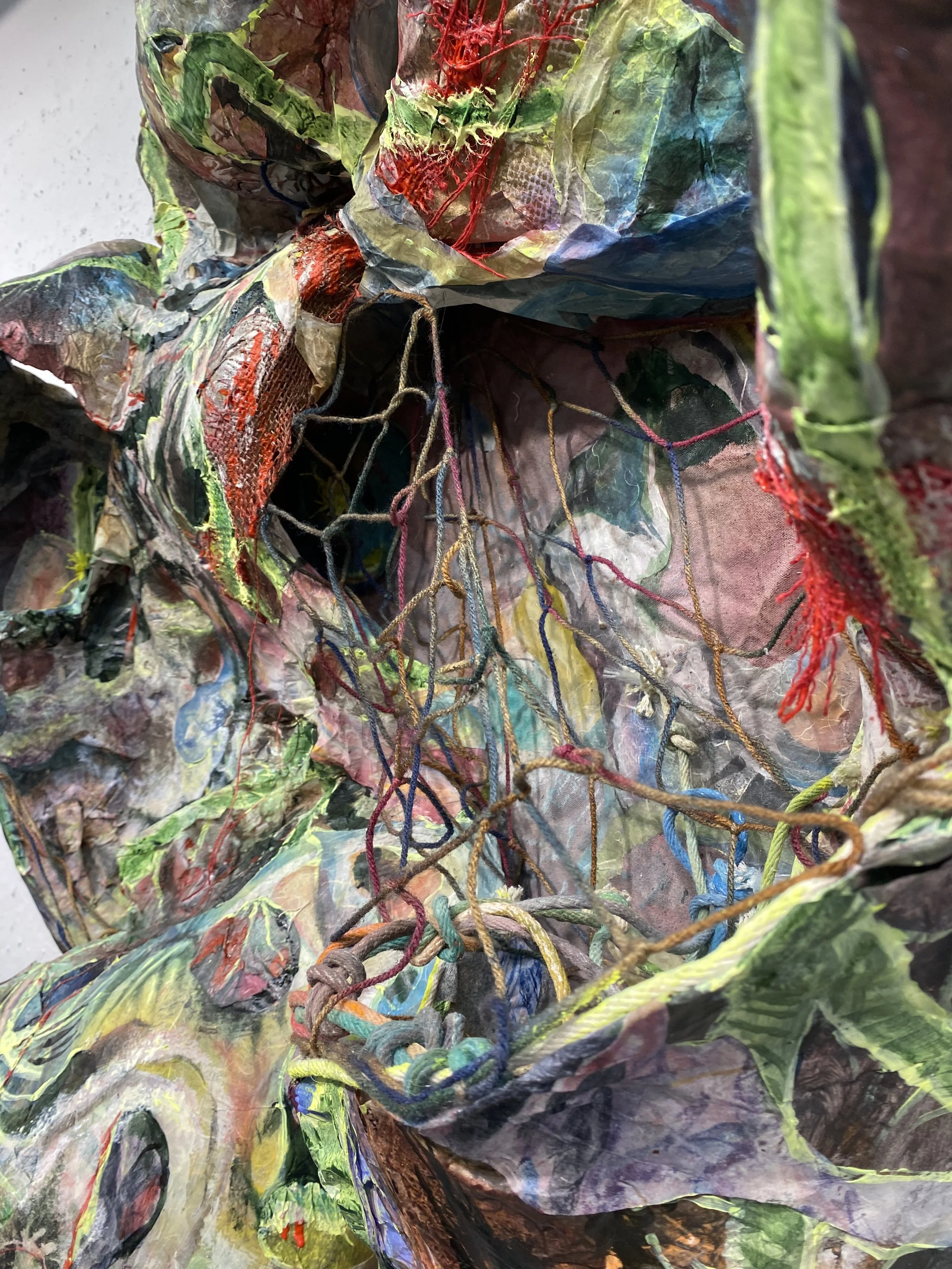 This cavernous sculpture is a highly layered and richly textured landscape, also behaving as a bodily figure with the sloping form and extended ‘limbs’. In this way, the cavern is living and mid-transformation, a cocoon of morphing matter. Utilizing the press for this process, as dozens of monotypes are embedded into the sculptural form, exemplifies the immense pressure which accompanies cavernous formations as well as queer desiring for transformation and change. This piece engages the viewer in a way that mimics the type of curiosity and transformation that fuels my practice for myself: A making process that engages my whole body and considers permeability between interiority and exteriority, and vulnerability. The viewer gets to take part in this three dimensional painting, where caverns dip into openings and one must follow their curiosity deeper into the piece. The cave is a place for exploring yearning, curiosity, rest, and radical desires. The cave both retreats and beckons, playing with ideas of tension and slack, tangle and fray.