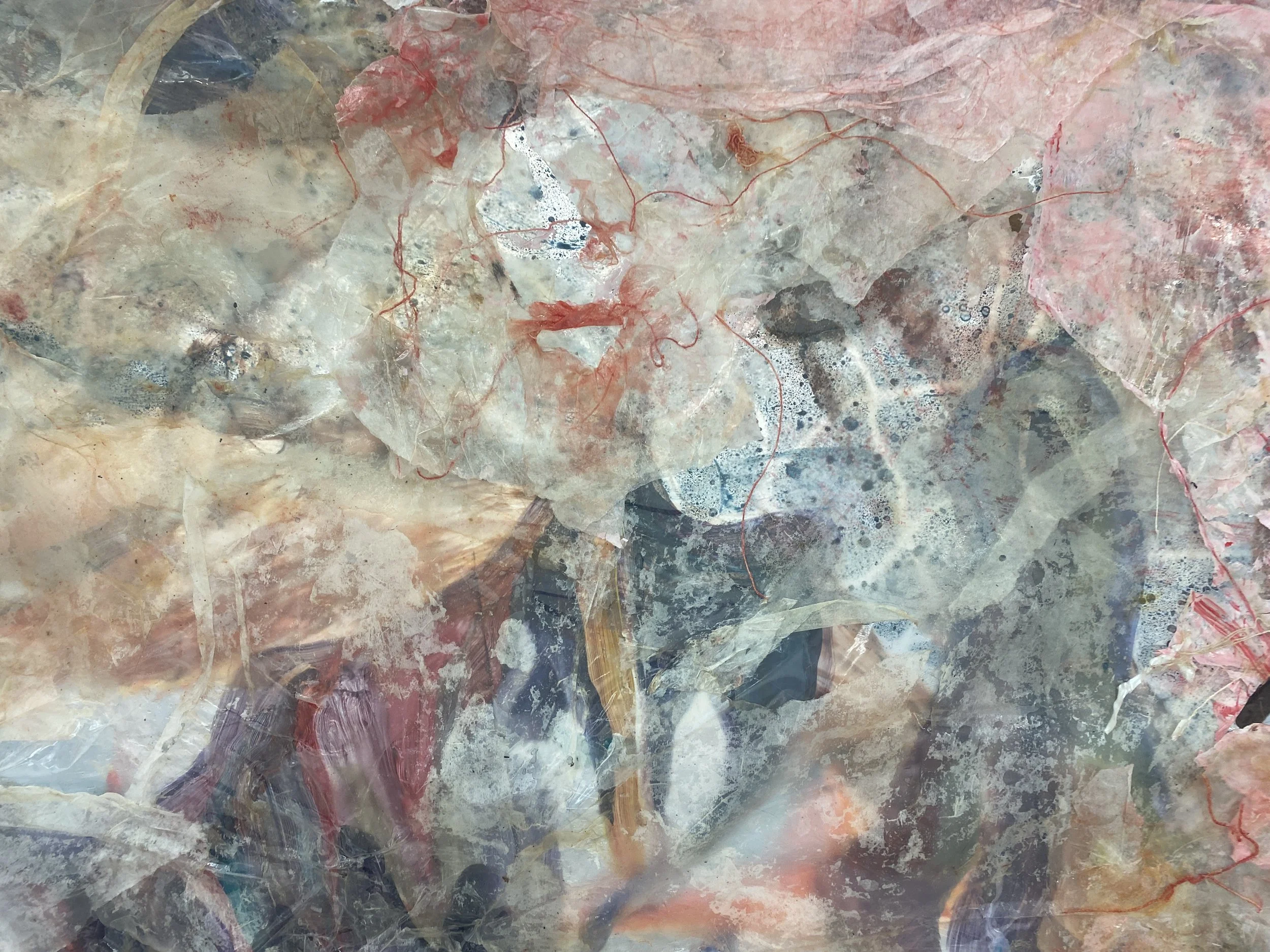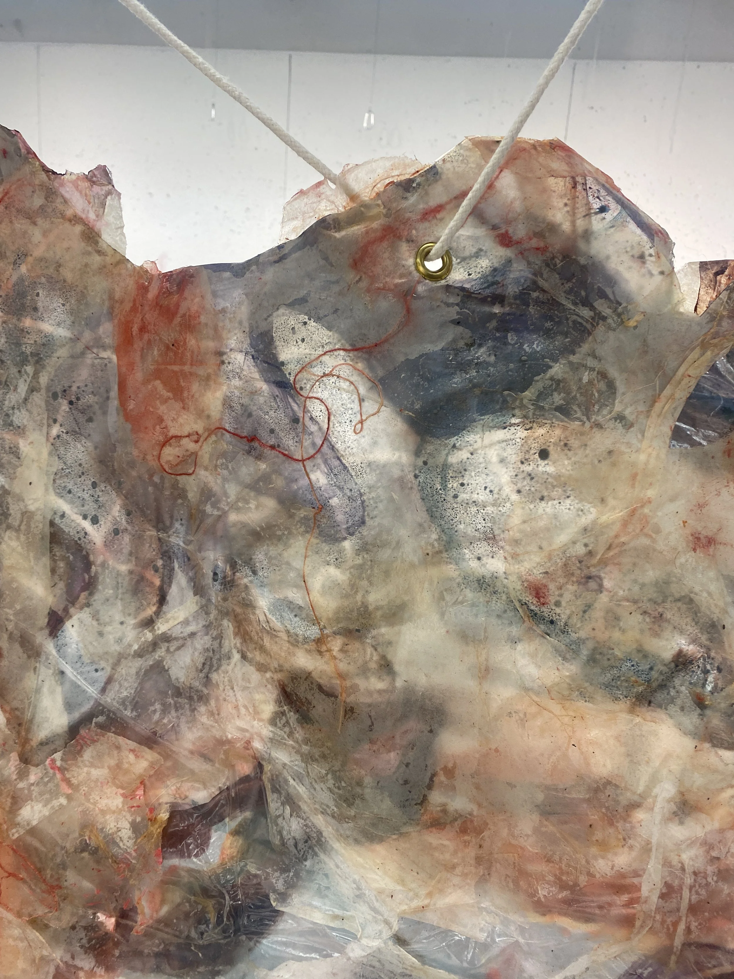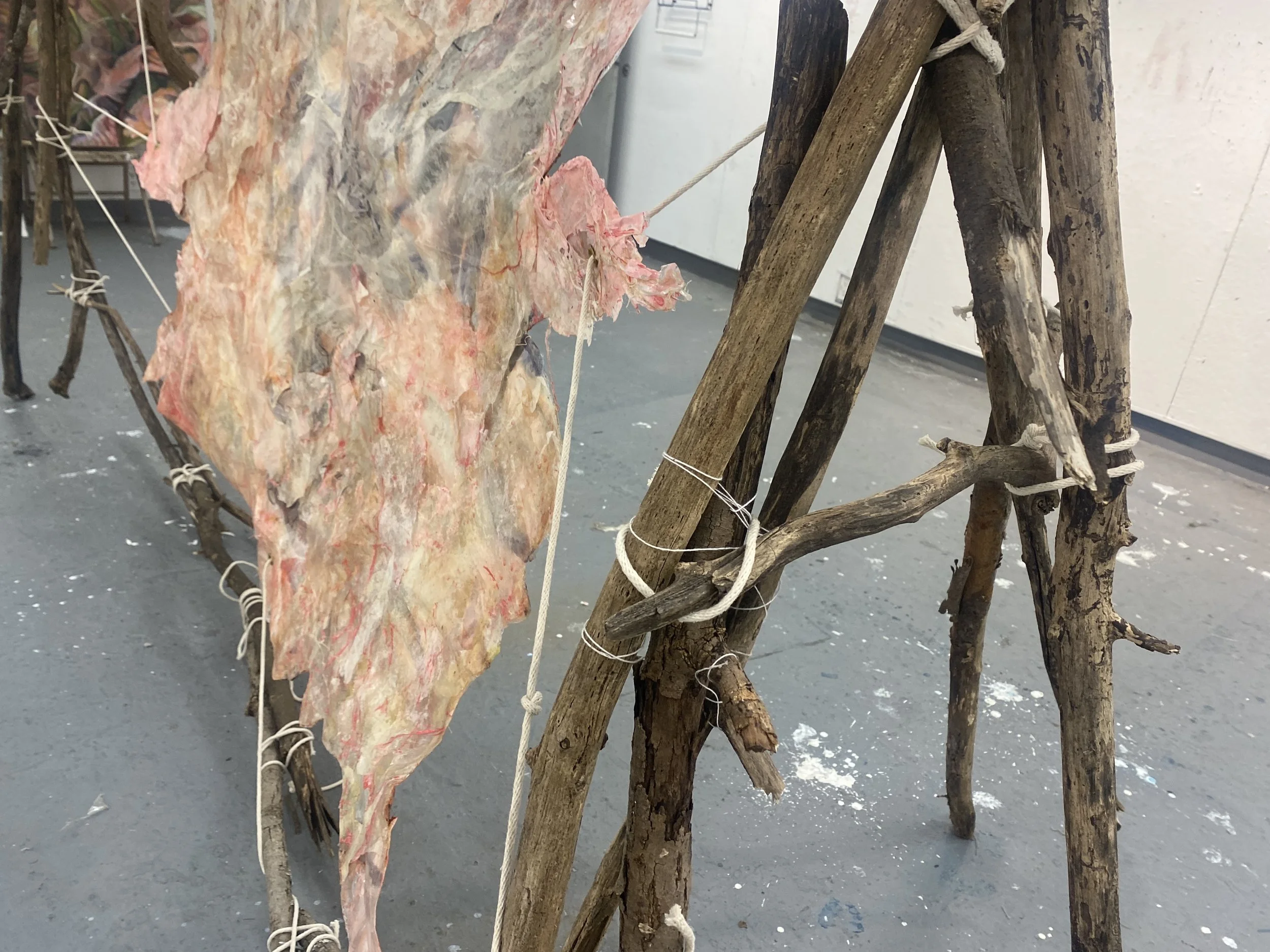 A skin not removed from a living being but made from the feeling of anticipating hunt and flee- Flight or fight. The desire to be swallowed up by the planet by one’s own terms, not a grave but a cavernous cocoon. And to be digested and changed by this escape. To know rest and be transformed in a way only possible in this exposure to one’s self in such a self contained system. Change and rest aren’t possible in the way that I desire now so my paintings provide the cave for me to tune into, an emergent, breathing boundary to be grounded in. This painting is made up of 4+ layers of translucent material which are melded and shaped into a stretched hide, complete with grommets and rope stretching it to the tanning rack