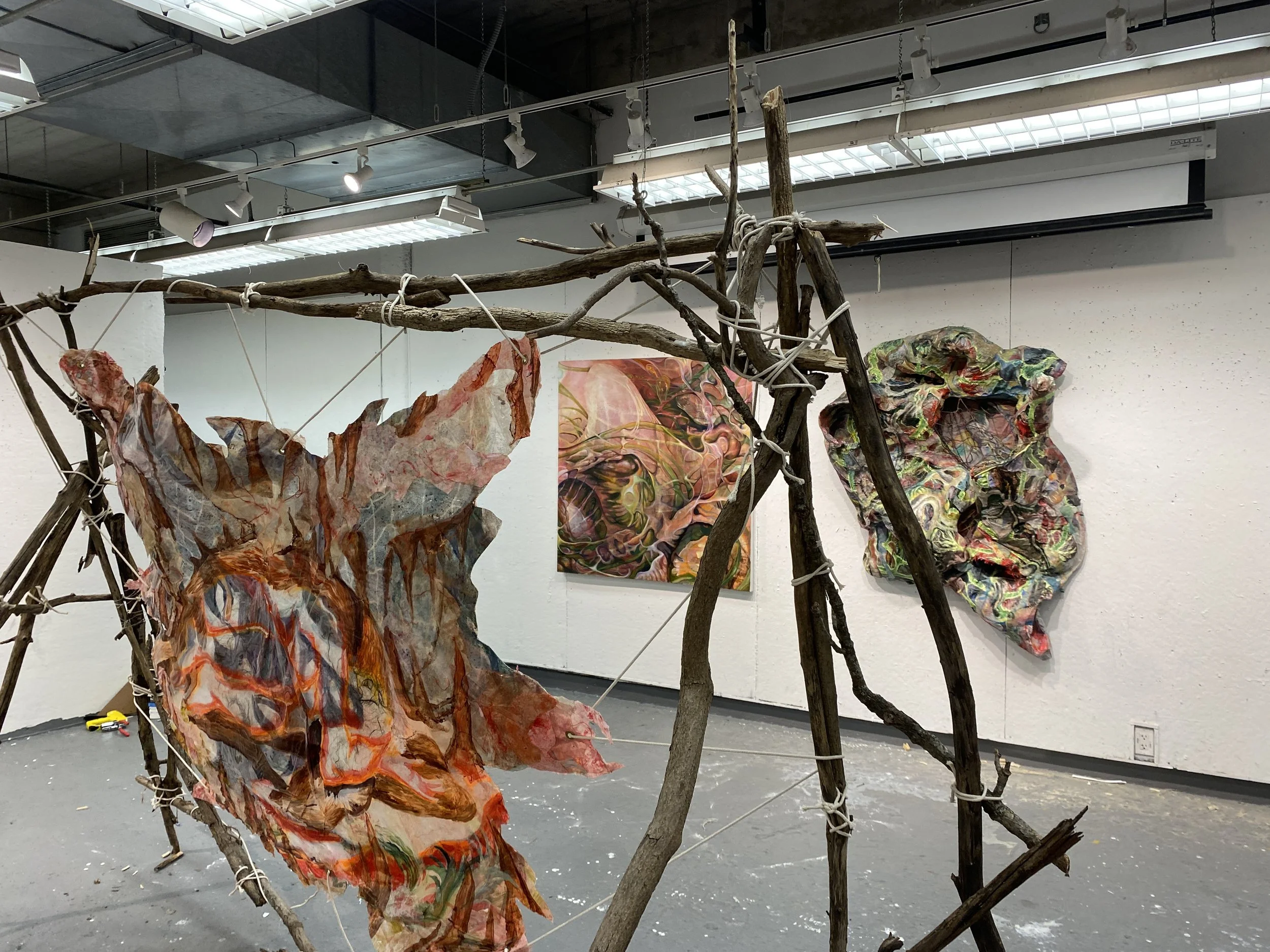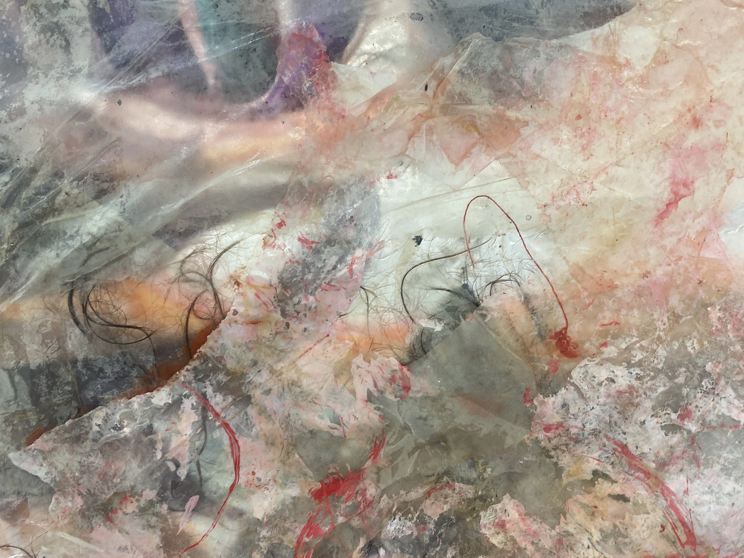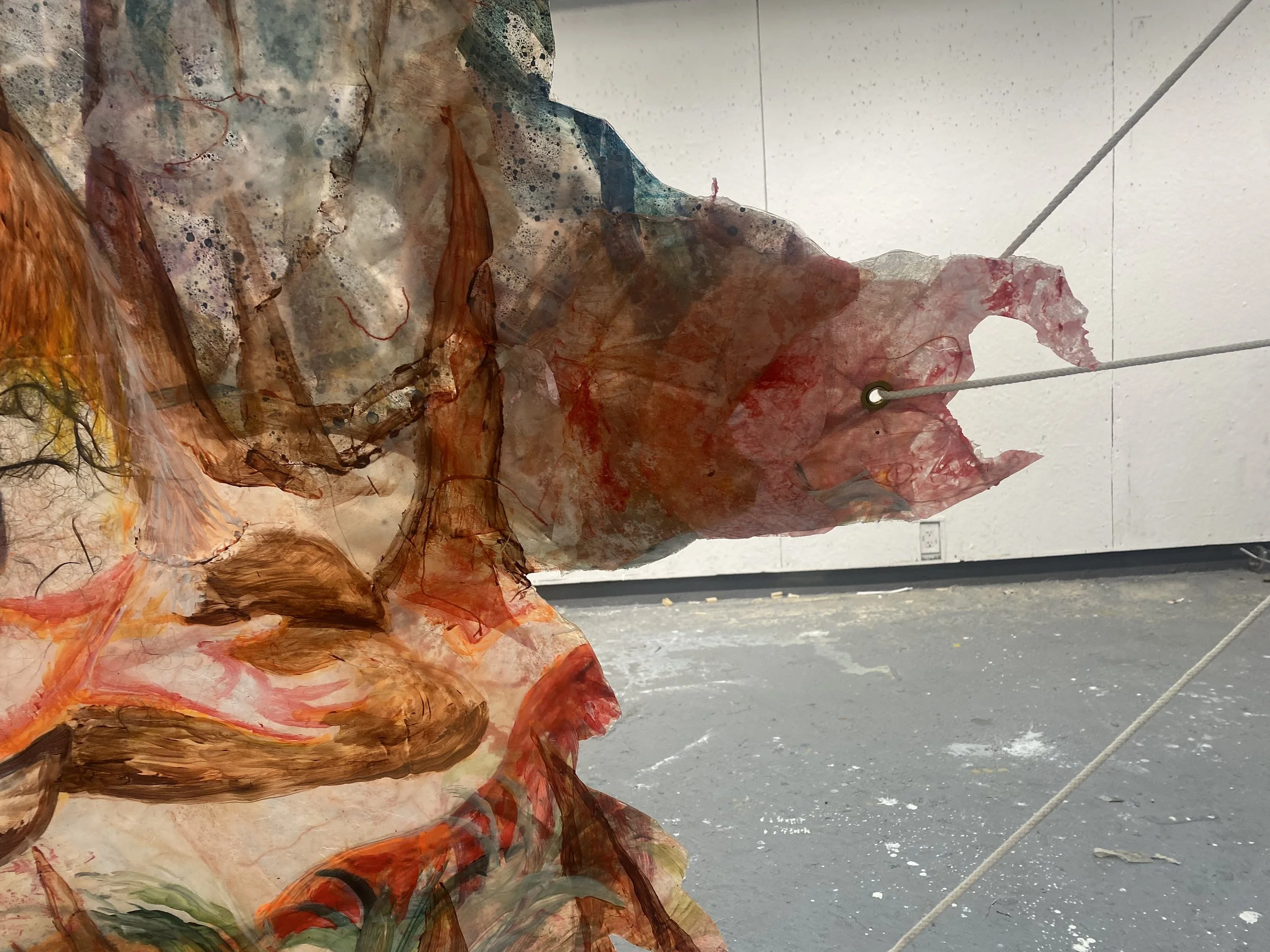 A skin not removed from a living being but made from the feeling of anticipating hunt and flee- Flight or fight. The desire to be swallowed up by the planet by one’s own terms, not a grave but a cavernous cocoon. And to be digested and changed by this escape. To know rest and be transformed in a way only possible in this exposure to one’s self in such a self contained system. Change and rest aren’t possible in the way that I desire now so my paintings provide the cave for me to tune into, an emergent, breathing boundary to be grounded in. This painting is made up of 4+ layers of translucent material which are melded and shaped into a stretched hide, complete with grommets and rope stretching it to the tanning rack