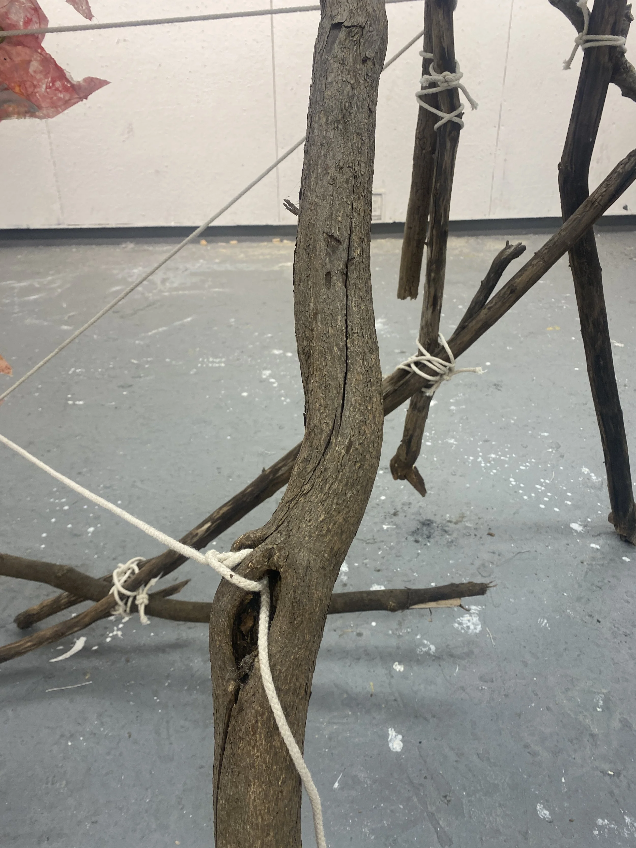 Plastics, fibrous papers, hair, acrylic, rope, and wood borrowed from the forest floor of East Providence.